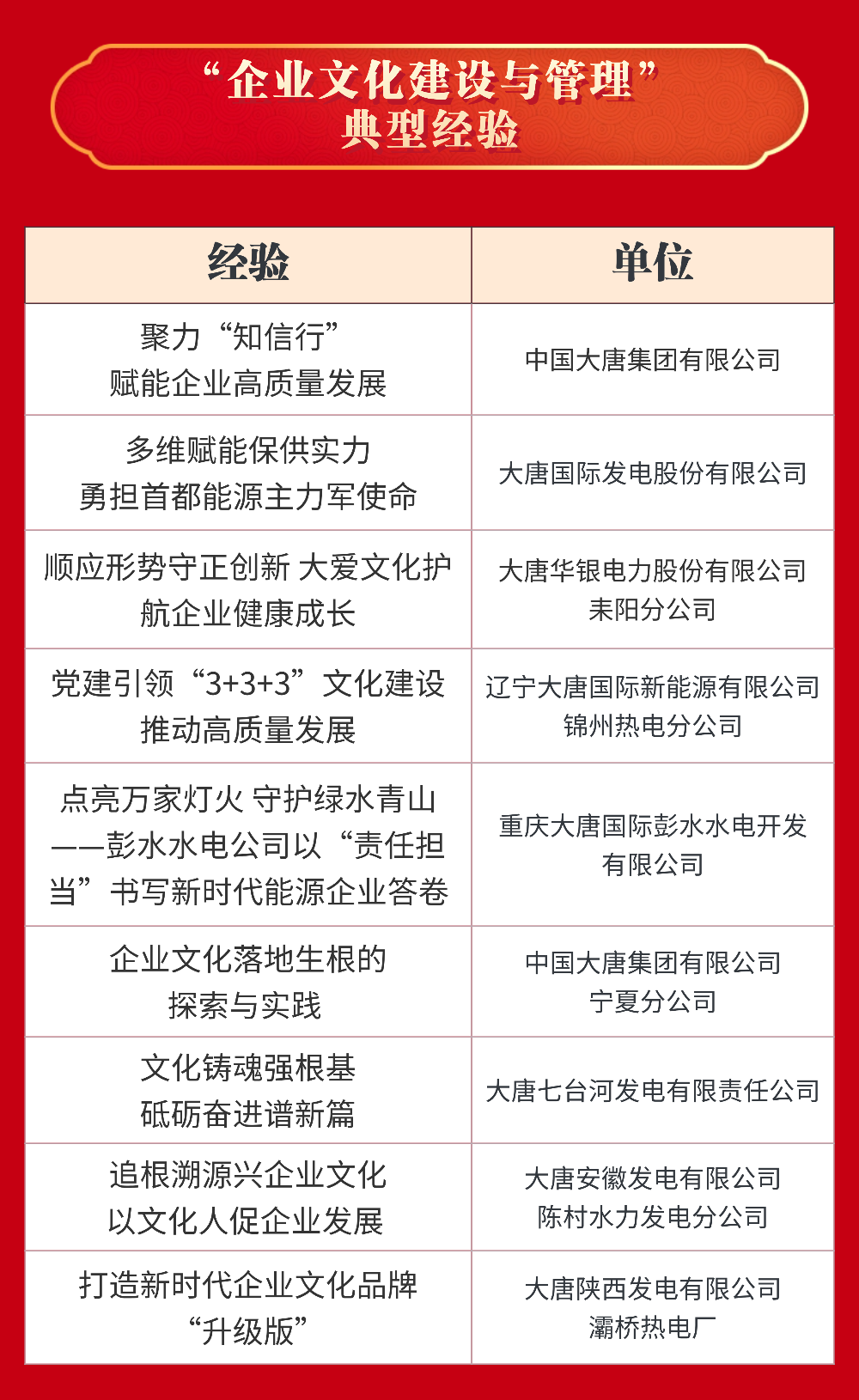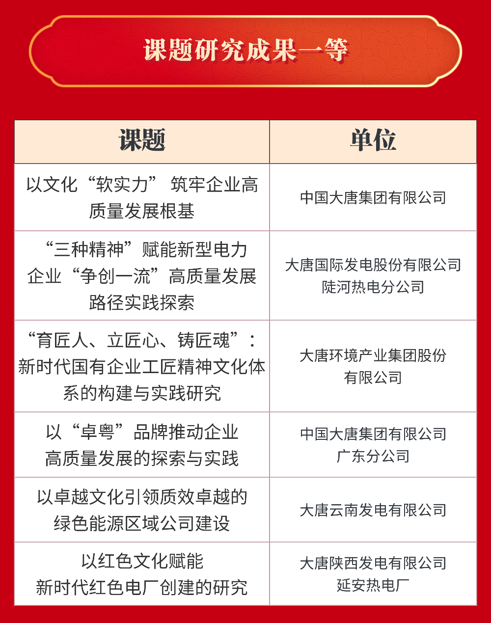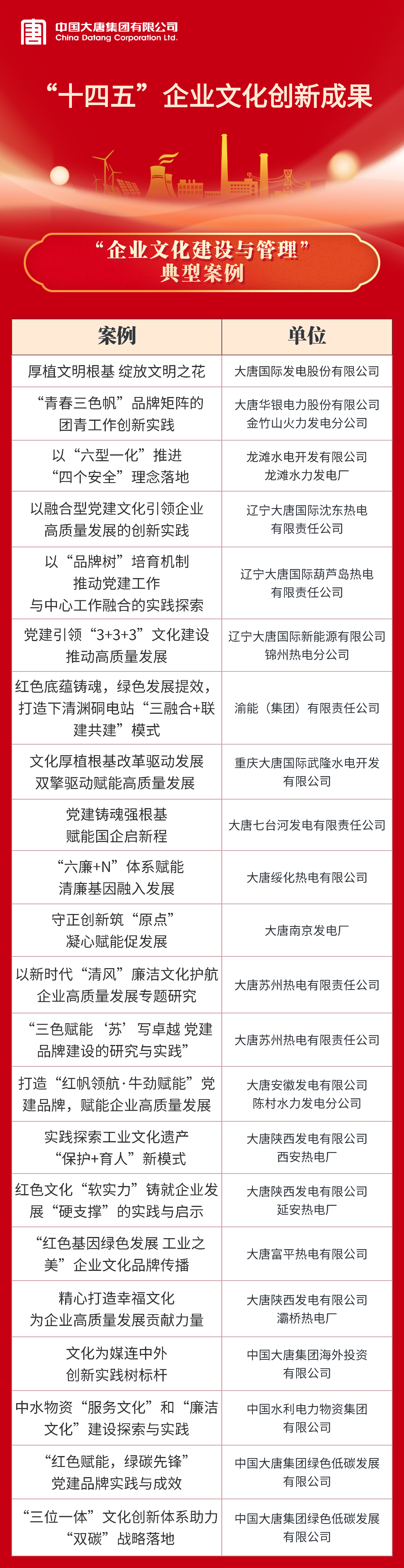 大唐國(guó)際發(fā)電股份有限公司等22家單位獲評(píng)“十四五”企業(yè)文化建設(shè)與管理典型案例;中國(guó)大唐及所屬8家單位獲評(píng)“十四五”企業(yè)文化建設(shè)與管理典型經(jīng)驗(yàn);中國(guó)大唐及所屬5家單位獲評(píng)課題研究成果一等;大唐國(guó)際發(fā)電股份有限公司張家口發(fā)電分公司等6家單位獲評(píng)課題研究成果二等。具體名單如下: