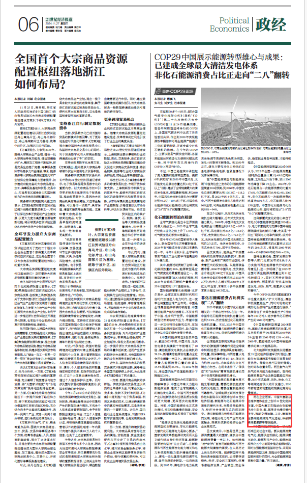 [21世紀經濟報]COP29中國展示能源轉型雄心與成果:非化石能源消費占比將“二八”翻轉,已建成全球最大清潔發電體系
