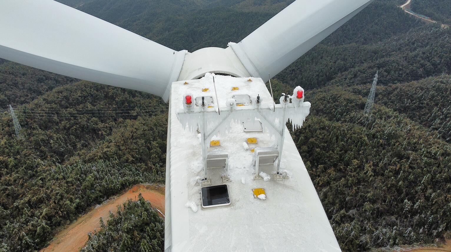 在此次覆冰前后的過程中,江西新能源公司運維人員緊盯設備情況,覆冰時及時手動停機,對解除覆冰的風機開展現(xiàn)場查看,確認后進行啟機,13個場站成功處理并解決7次因冰雪造成的集電線路和外送線路跳閘事件和多臺箱變外殼被葉片融冰砸損情況。