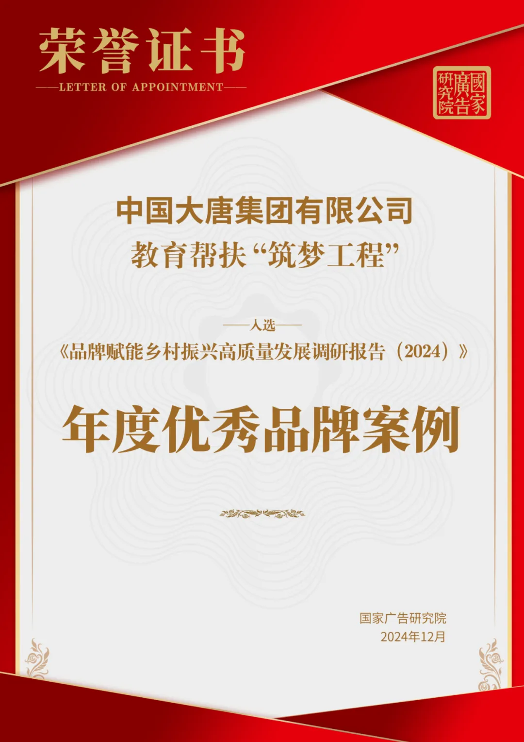 近日,由中國廣告協(xié)會指導,國家廣告研究院與新華網(wǎng)鄉(xiāng)村振興研究院聯(lián)合主辦的《品牌賦能鄉(xiāng)村振興高質(zhì)量發(fā)展研究報告(2024)》發(fā)布暨鄉(xiāng)村振興品牌發(fā)展評價指標體系論證會在京舉行,會上發(fā)布了2024年度優(yōu)秀品牌案例。憑借在品牌賦能鄉(xiāng)村振興工作中的突出表現(xiàn),《中國大唐教育幫扶“筑夢工程”》入選年度優(yōu)秀品牌案例。